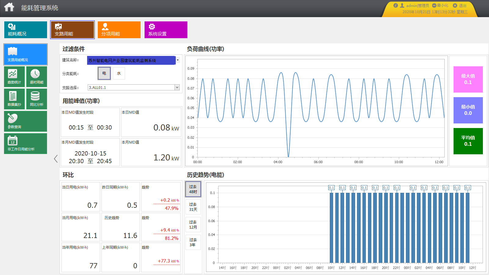 系統可以統計各支路某段時間內逐日、逐周、逐月、逐季、逐年用能。系統可查看各支路用能趨勢,可根據已有的日期或者自定義時間進行查詢,并可以將支路用能顯示合計,以圖表形式顯示。