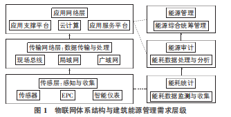 公共建筑能源管理系統(tǒng)包含了設(shè)置在建筑中不同位置的物聯(lián)網(wǎng)終端、物聯(lián)網(wǎng)能源管理平臺(tái)以及通信設(shè)施,而物聯(lián)網(wǎng)獨(dú)特的體系結(jié)構(gòu)剛好可以對(duì)應(yīng)滿足建筑能源管理系統(tǒng)的多層需求(見圖1)。