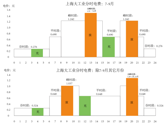 在7-9月夏季時段,每天凌晨在3:00-5:00低谷時執行充電,在12:00-14:00峰時段(7-8月執行尖峰時段)放電;然后在15:00-17:00平時段充電,在19:00-21:00峰時段放電。
