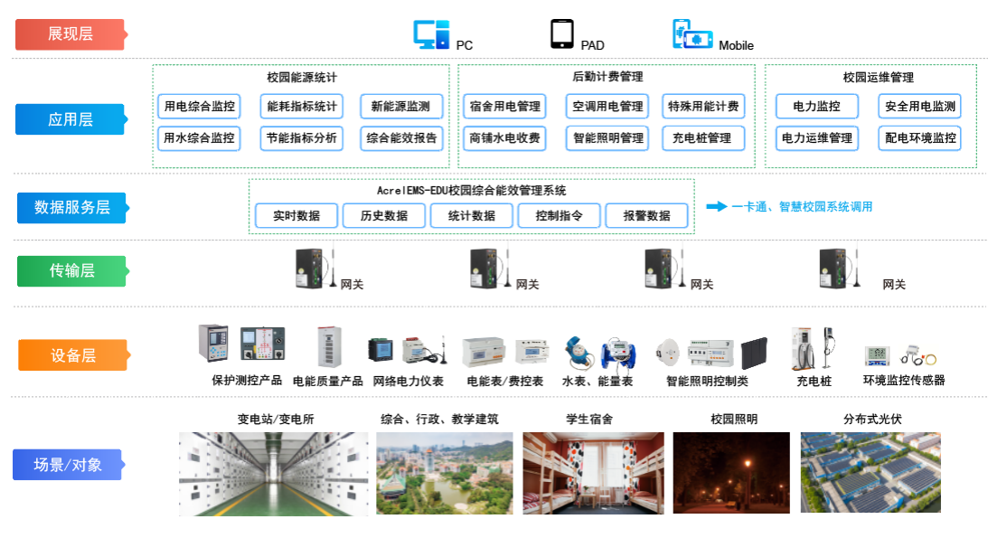 AcrelEMS-EDU高校綜合能效管理平臺采用開放的分層分布式網(wǎng)絡結構,主要由設備層、傳輸層、數(shù)據(jù)層、應用層組成。AcrelEMS-EDU高校綜合能效平臺提供校園用能實時在線監(jiān)控、能耗數(shù)據(jù)統(tǒng)計分析、空調智能管理、用能排名、節(jié)能評估、宿舍惡性負載監(jiān)管等功能。
