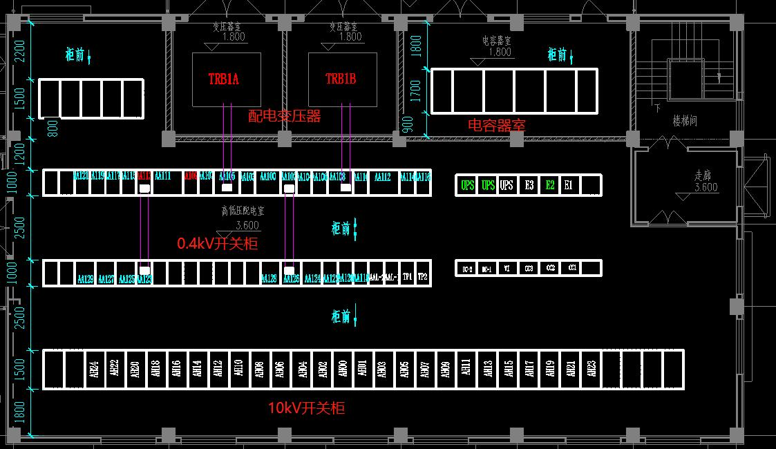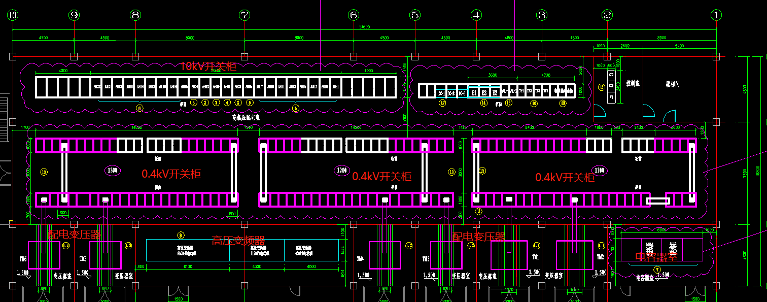 本工程為山東凱瑞英材料科技有限公司35kV供配電工程,共有35kV總變電所一個(gè),包括35kV配電系統(tǒng)和總變10kV配電系統(tǒng); 10kV循環(huán)水場變電所一個(gè);10kV裝置變電所一個(gè)。本工程由兩路35kV電源供電,安裝兩臺容量為16MVA的主變壓器。35kV總變電所配置8面KYN61-40.5中置式開關(guān)柜,進(jìn)出線方式為電纜下進(jìn)下出,柜體顏色為RAL7035,斷路器選用VBG-40.5P-31.5,電流互感器選用LZZBJ9-35D1;配置25面KYN28A-12(Z)中置式開關(guān)柜,進(jìn)出線方式為銅排上進(jìn),電纜下出,柜體顏色為RAL7035,斷路器選用VBG-E-12P-31.5,電流互感器選用LZZBJ9-10C1。循環(huán)水場變電所配置25面KYN28A-12(Z)中置式開關(guān)柜,進(jìn)出線方式為電纜下進(jìn),電纜下出,柜體顏色為RAL7035,斷路器選用CZK2-12-31.5,電流互感器選用LZZBJ9-10C1。裝置變電所配置24面KYN28A-12(Z)中置式開關(guān)柜,進(jìn)出線方式為電纜下進(jìn),電纜下出,柜體顏色為RAL7035,斷路器選用CZK2-12-31.5,電流互感器選用LZZBJ9-10C1。本工程共有一個(gè)35kV變電站和1個(gè)10kV開閉所,2個(gè)10kV變電所,35kV市電引入后經(jīng)由35kV/10kV變壓器,降至10kV電引入開閉所,再由開閉所進(jìn)行分配電能至各個(gè)分變電所,整個(gè)變電站的一次系統(tǒng)干線圖以及平面布局圖如下: