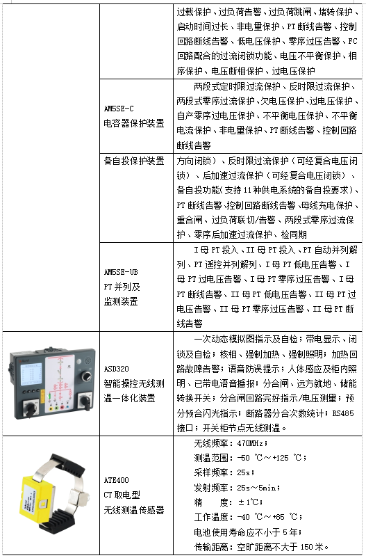 本次針對該35kV配電工程項(xiàng)目中不同保護(hù)對象配置不同微機(jī)保護(hù)裝置,35kV主變柜按主保護(hù)加后備保護(hù)配置:差動(dòng)保護(hù)裝置AM5SE-D2、高后備保護(hù)裝置AM5SE-TB;35kV進(jìn)線柜配置AM5SE-F線路保護(hù)裝置;35kV分段柜配置AM5SE-B備自投保護(hù)裝置;35kV母線設(shè)備柜配置AM5SE-UB PT并列及監(jiān)測裝置;10kV開閉所進(jìn)線柜配置AM5SE-TB低后備保護(hù)裝置;裝置變電所和循環(huán)水場變電所10kV進(jìn)線柜配置AM5SE-F線路保護(hù)裝置;10kV備用出線柜配置AM5SE-F線路保護(hù)裝置;10kV電容補(bǔ)償柜配置AM5SE-C電容器保護(hù)裝置;10kV電動(dòng)機(jī)出線柜配置AM5SE-M電動(dòng)機(jī)保護(hù)裝置,10kV變壓器出線柜配置AM5SE-T變壓器保護(hù)裝置;10kV分段柜配置AM5SE-B備自投保護(hù)裝置;10kV母線設(shè)備柜配置AM5SE-UB PT并列及監(jiān)測裝置。其中,根據(jù)本次項(xiàng)目需求,在AM5SE-TB低后備保護(hù)裝置上增加遙控升檔,遙控降檔,遙控急停,來實(shí)現(xiàn)主變壓器的檔位調(diào)節(jié),并采集變壓器的檔位信號,上傳至電力監(jiān)控系統(tǒng);在35kV側(cè)進(jìn)線柜和分段柜對應(yīng)的保護(hù)裝置增加檢同期功能,確保在停電檢修時(shí),為不影響正常生產(chǎn),能夠可靠合環(huán)。針對各高壓開關(guān)柜配置智能操控?zé)o線測溫一體化裝置ASD320,每面開關(guān)柜配置6點(diǎn)測溫,其中,PT柜配置電池型無線測溫傳感器ATE200,其余高壓開關(guān)柜配置CT取電型無線測溫傳感器ATE400。各型號產(chǎn)品主要實(shí)現(xiàn)的功能如下:
