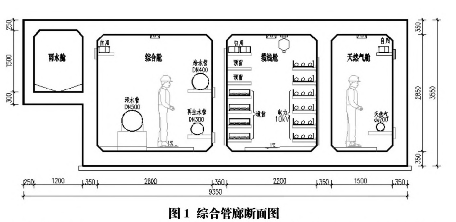 西安市某新區(qū)南北三號路綜合管廊為該區(qū)先期啟動建設(shè)的管廊之一,位于道路非機動車道及人行道下,全長約1.1km。收納的管線包括電力、通信、給水、再生水、污水、雨水、天然氣,設(shè)有綜合艙、纜線艙、天然氣艙、雨水艙,采用鋼筋混凝土結(jié)構(gòu),詳見圖1。