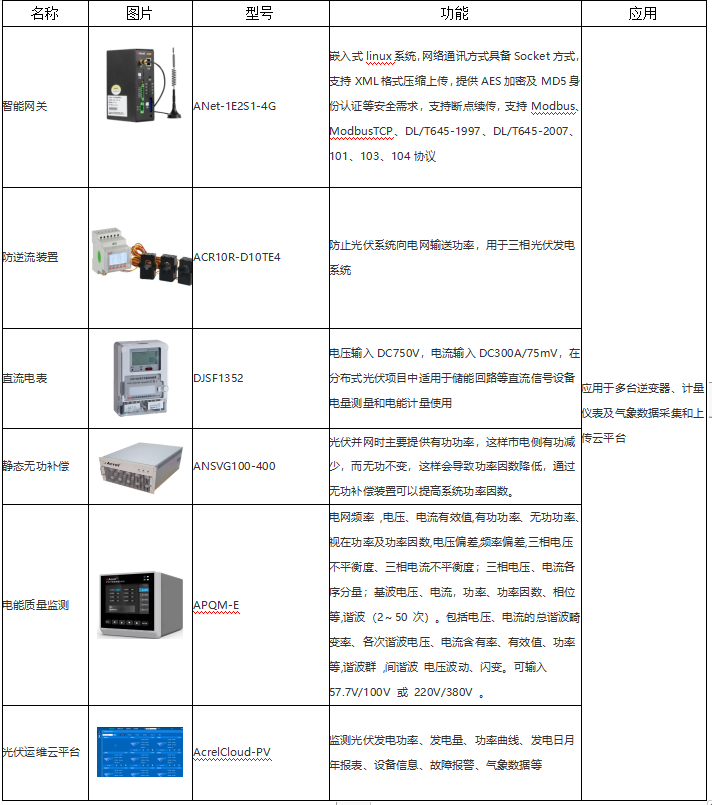 部分小型光伏電站為自發自用,余電不上網模式,這種類型的光伏電站需要安裝防逆流保護裝置,避免往電網輸送電能。光伏電站規模較小,而且比較分散,對于光伏電站的管理者來說,通過云平臺來管理此類光伏電站非常有必要,安科瑞在這類光伏電站提供的解決方案包括以下方面: