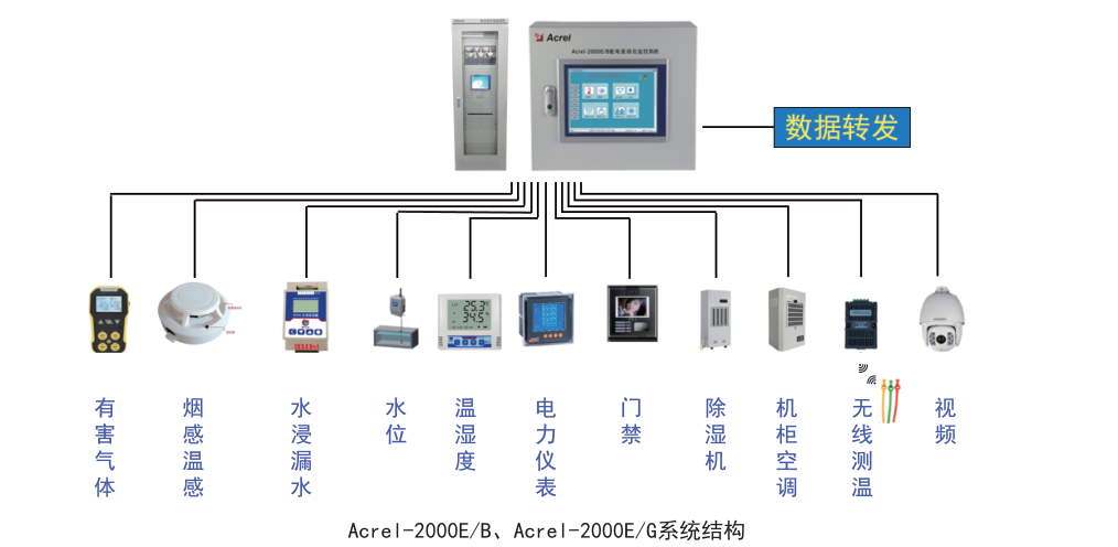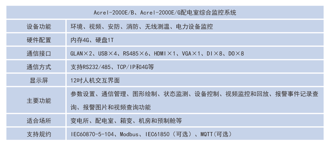 由于硬件資源以及系統(tǒng)軟件上的差別,Acrel-2000E/A作為針對(duì)變電所配電室的環(huán)境輔助監(jiān)控系統(tǒng),只對(duì)環(huán)境參量設(shè)備進(jìn)行在線監(jiān)測(cè);而Acrel-2000E/B與Acrel-2000E/G作為硬件資源豐富,系統(tǒng)功能更為強(qiáng)大的設(shè)備,可以配合我司無(wú)線測(cè)溫以及電力儀表進(jìn)行在線監(jiān)測(cè)。
