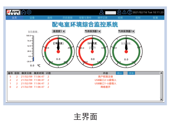 觸摸屏上電進(jìn)入工作狀態(tài)后,默認(rèn)為主界面,在此界面可觀察到配電室環(huán)境溫濕度、SF6氣體和O2濃度等監(jiān)測(cè)信息以及當(dāng)前事件列表。