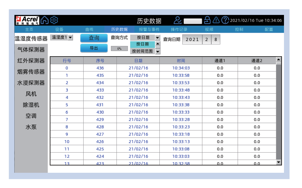 在“歷史事件”的界面,同“歷史數(shù)據(jù)”界面一樣,表格上方的查詢及導(dǎo)出按鈕分別提供相應(yīng)的查詢和導(dǎo)出功能,并且可以根據(jù)所選擇的不同查詢方式進(jìn)行不同方式的查詢功能。