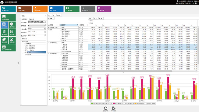 系統可以根據分類能耗的支路名稱查詢用能情況,顯示當日和當月的用能峰值(電能對應最大需量值)。顯示當日用能、當月用能、當年用能與昨日同期用能、上月同期用能、上年同期用能的比較情況。以條形顯示過去48小時、31天、12個月、3年的能耗情況。右上角顯示過去15分鐘曲線(電表顯示功率曲線,流量表顯示流速曲線),同時顯示當前值與15分鐘內的最大值和最小值。